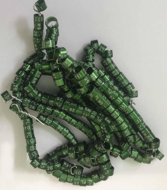 Obrączki na rok 2026 kolor zielony - [21.2. 2026]Obrączki aluminiowe w kolorze zielonym na rok 2026 . Grawer PL 26, rozmiar obrączki, kolejny numer 001 do 100