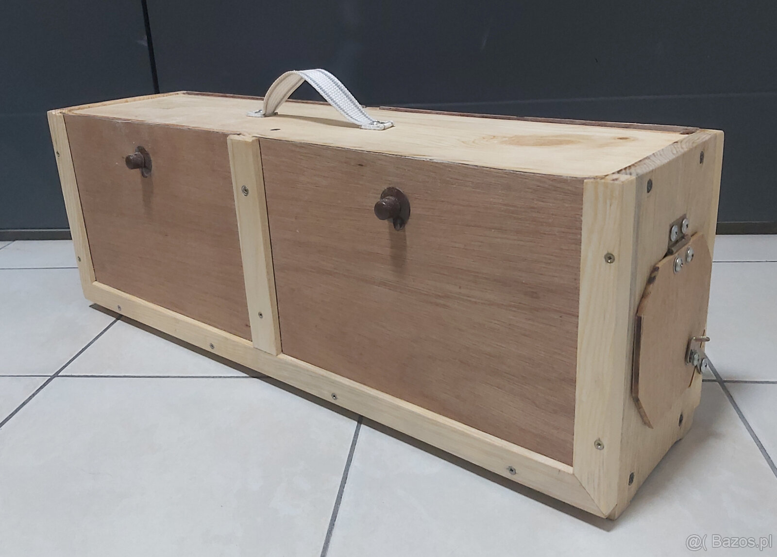 Posiadam pojedynczy dwukomorowy transporter do przewozu małych przedmiotów egzotycznych, wykonany z drewna sosnowego pokrytego warstwą lakieru, każda komora dodatkowo zabezpieczona. Tylna część jest zdejmowana, co umożliwia czyszczenie,